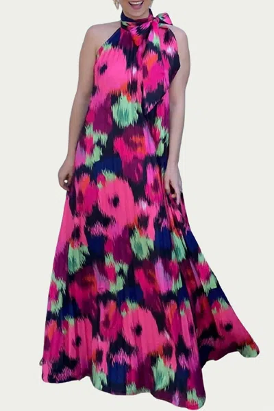 Poppy Pleated Satin Maxi Dress In Ikat Roses In Pink