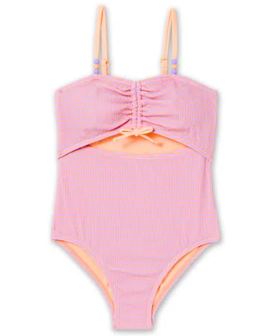 Kids' Girls 7-16 Popcorn Scrunch Stripe Square Neck One-piece Swimsuit In Pink