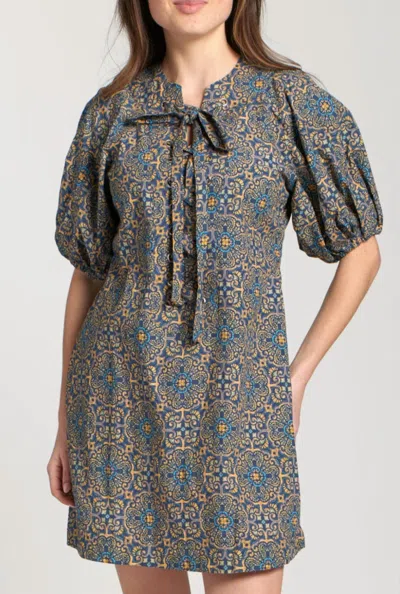 Laced Up Puffed Sleeve Dress In Indigo Multi In Blue