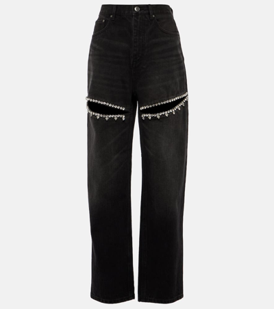 Crystal Cutout Slit Straight Leg Jeans In Black