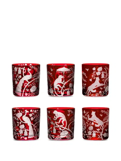 Chinoiserie Monkey Etched Glass Tumblers (set Of Six) In Red
