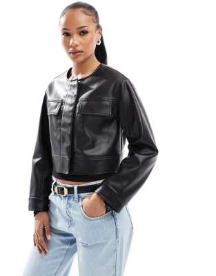 Asos Design Petite Cropped Collarless Leather Look Jacket In Black