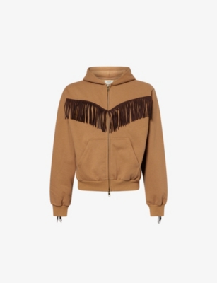 Mens Fringed Zip-up Cotton Hoody In Brown