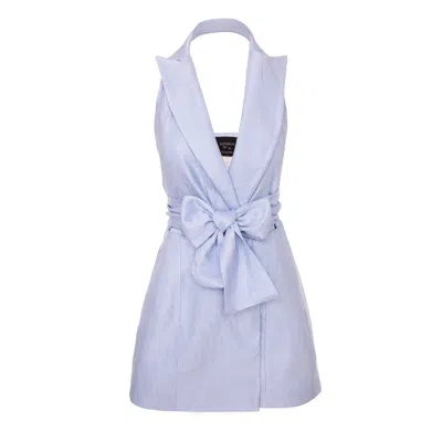 Women's Metallized Linen Backless Lapel Dress With Bow - Blue
