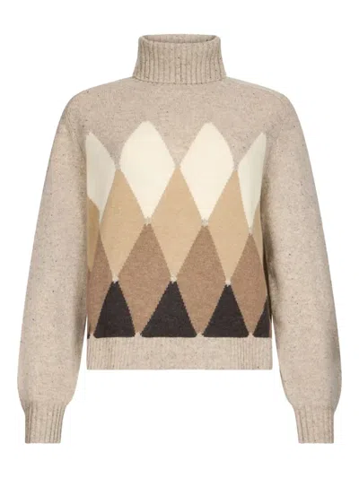 Turtleneck Argyle Knit Pullover With Long Sleeves In Neutral