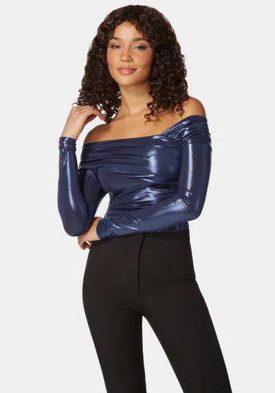 Coated Knit Combo Mesh Halter Neck Bodysuit In Galactic Cobalt