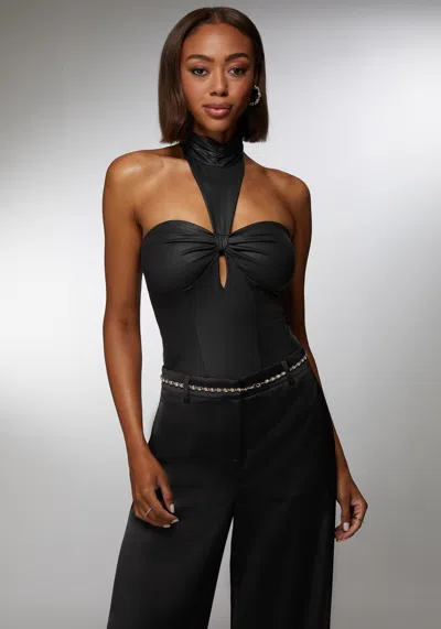 X Ciara Mock Neck Halter Coated Knit Bodysuit In Black