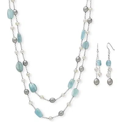 Aquamarine & Freshwater Pearl Station Necklace In Sterling Silver In Blue