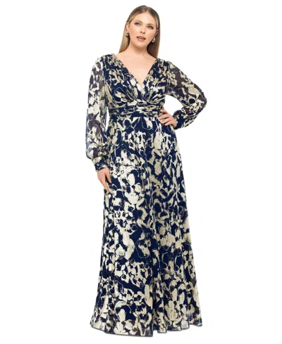 Foil Pattern Long Sleeve Gown In Blue