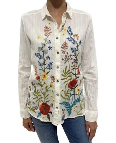 Pre-owned Johnny Was Provence White Long Button Down Top Flower Embroidery