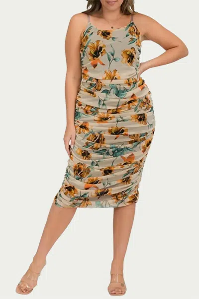 Floral Ruched Mesh Midi Dress In Taupe In Multi