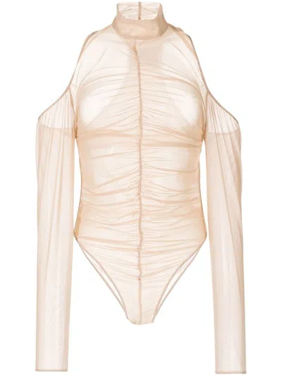 Ruched Mesh Bodysuit In Brown