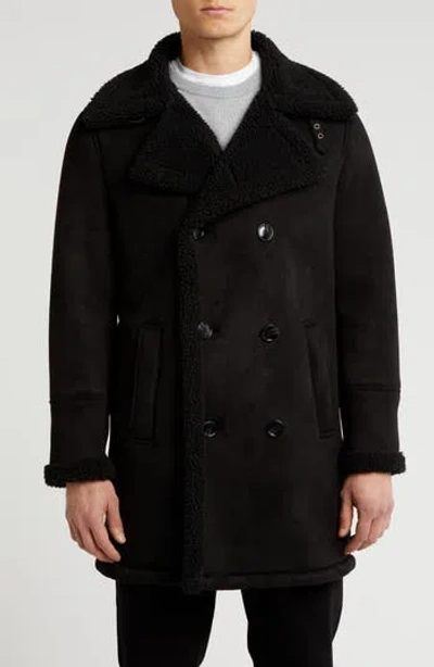 Faux Shearling Lined Double-breasted Overcoat In Black