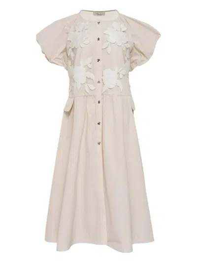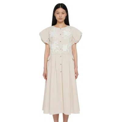 Floral-embroidered Puff-sleeve Midi Dress In Neutral