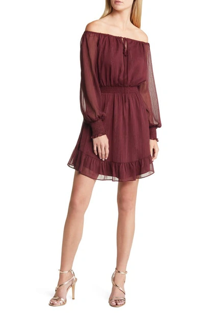 Metallic Off The Shoulder Long Sleeve Minidress In Wine