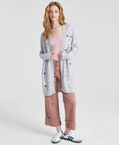 Women's Petite Cashmere Heart-embroidered Long Open Cardigan, Created For Macy's In Gray