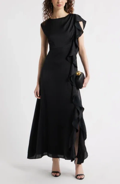 Cascading Ruffle Crepe One-shoulder Gown In Black