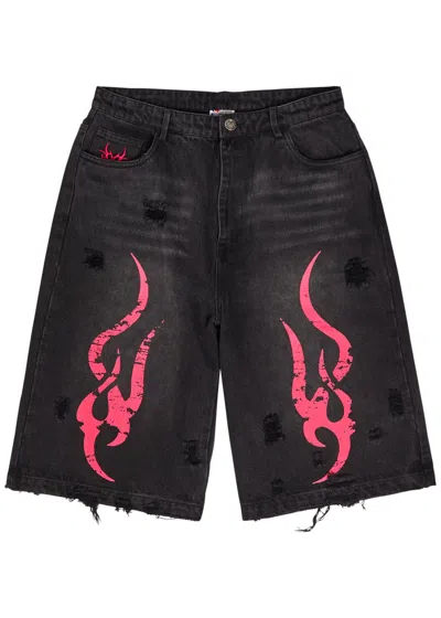 Tribal-printed Denim Shorts In Black