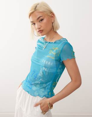 Sheer Hibiscus Print Mesh Double Layer Top-blue