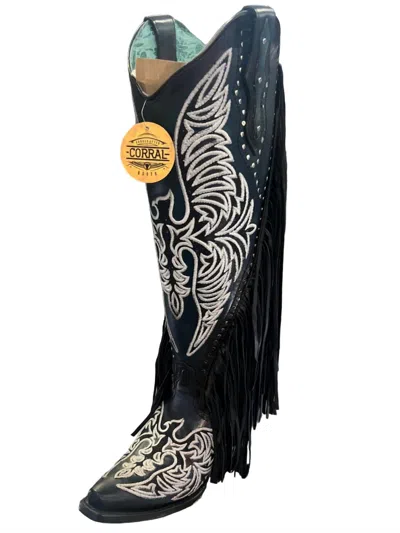 Women's Eagle Embroidery Studs Fringes Western Boot In Black