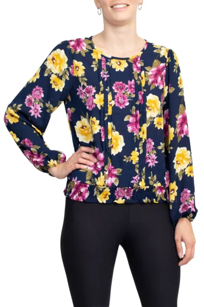 Crew Neck Elastic Cuff Pleated Front Crepe Top In Blue Radiance In Multi
