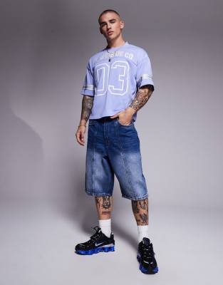 Panel Detail Denim Jorts With Back Pocket Logo Embroidery In Blue