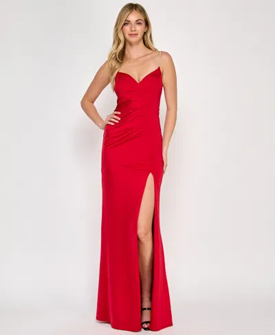 Juniors' Rhinestone Lace-up-back Satin Gown In Cherry