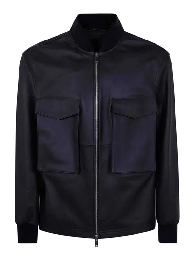 Leather Patch Pocket Bomber Jacket In Blue