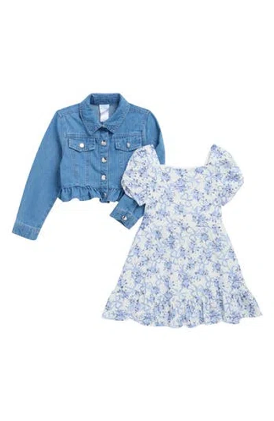 Kids' Floral Dress & Ruffle Denim Jacket Set In Blue