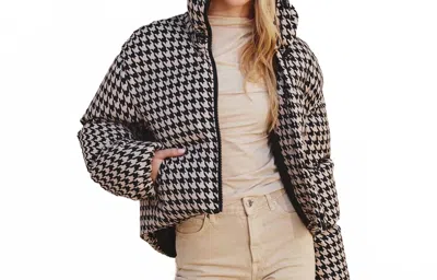 Houndstooth Stand Collar Puffer Jacket In Black/ Tan In Gray
