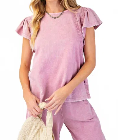 Washed Wing Sleeve Crochet Trim Top In Antique Rose In Purple