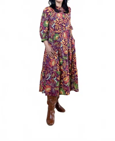 3/4 Sleeve Midi Dress In Burgundy Print In Multi