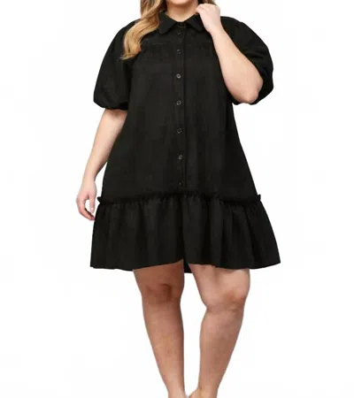 Darby Faux Suede Button Front Short Puff Sleeve Dress In Black