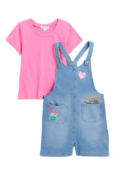 Kids' Denim Shortall & T-shirt Set In Hot Pink/blue