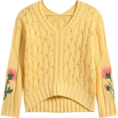 Kids' Flower Embroidered Pointelle V-neck Sweater In Yellow