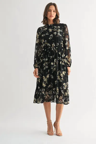 Flower Ruffle Midi Dress In Black