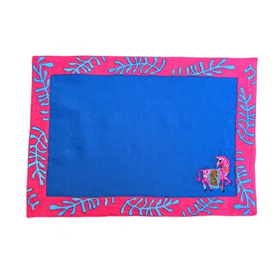Pink / Blue Pink Horse Embroidered Premium Linen Placemat Set Of Two In Multi