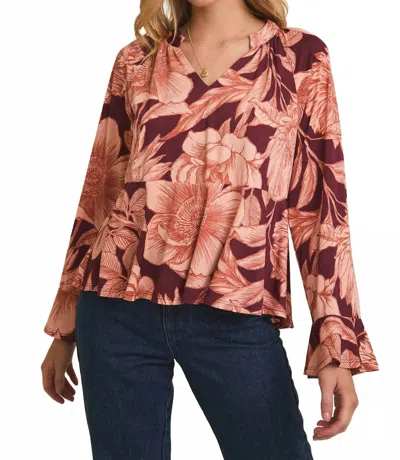 Clarissa Floral Flare Long Sleeve Top In Burgundy In Multi