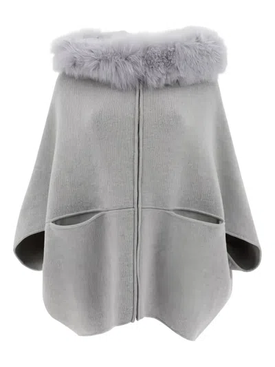 Wool And Cashmere Poncho With Fur Collar In Blue