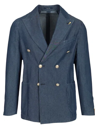 Double-breasted Blazer In Washed Denim Jackets Blue