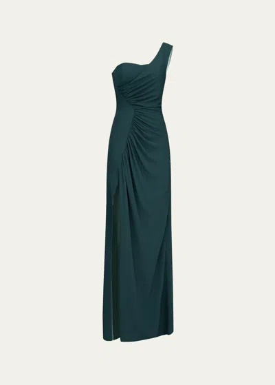 Verdianna Ruched One-shoulder Crepe Gown In Dark Green