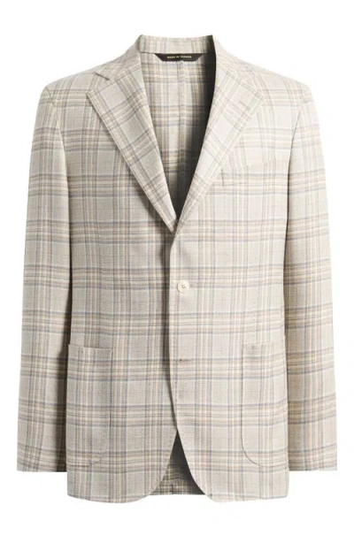 Tan & Grey Plaid Wool & Silk Blend Sport Coat In Gray