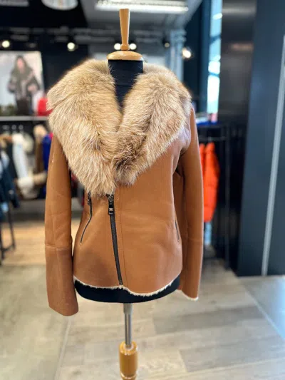 Pre-owned Women's Quality Genuine Shearling Coat With Genuine Fox Collar, Winter Coat In Brown