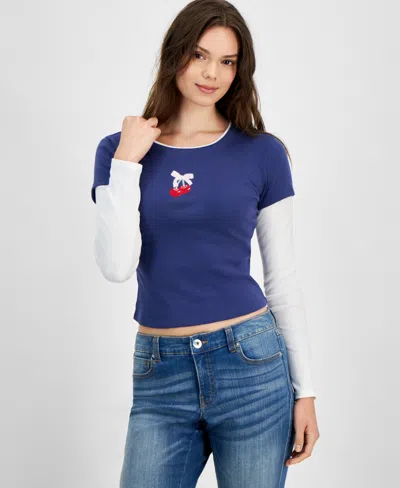 Juniors' Graphic Faux Two-fer Crewneck Long Sleeve In Navy Cherry