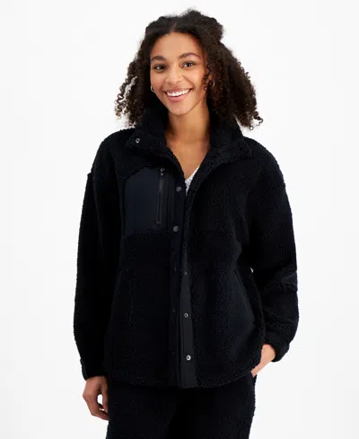 Juniors' Snowflake Sherpa Snap-front Jacket & Sherpa Claw Clip In Black