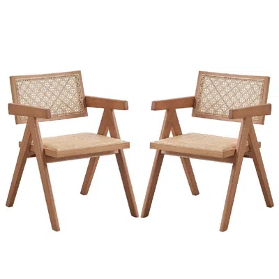 Tina 22 Inch Dining Armchair Set Of 2, Woven Rattan, Natural Brown Wood
