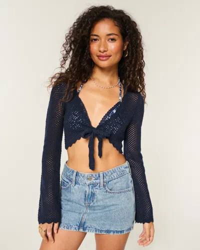 Cropped Tie Front Long Sleeve Top In Blue