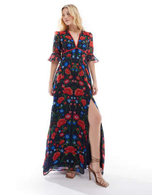 Frill Sleeve Wrap Front Maxi Dress In Multi