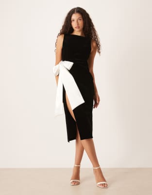 Midi Dress With Contrast Satin Bow In Black