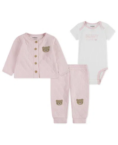 Baby Girl Short Sleeve Bodysuit, Quilted Cardigan And Pant, 3-piece Set In Pink